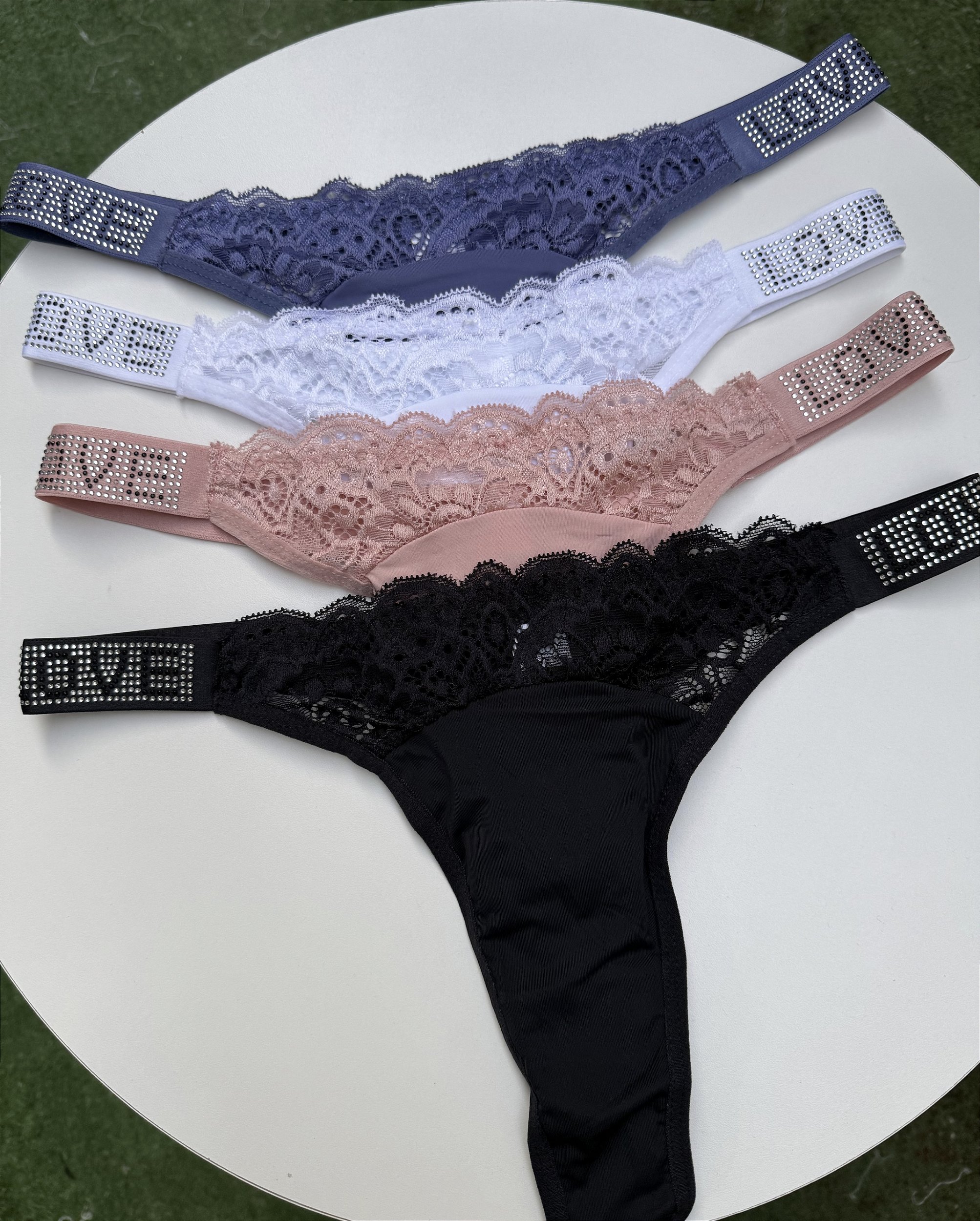 ⚜️ Em renda e microfibra de poliamida, aplicação em strass escrito "LOVE LOVE" na lateral, com o fundinho forrado em algodão. • Disponível M e G